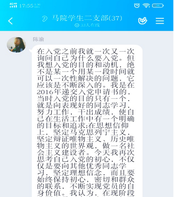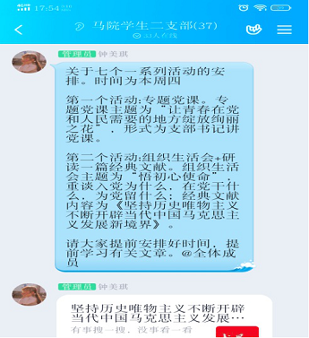 为做好毕业生党员离校前的有关工作,加强毕业生党员的教育管理,进一步提高毕业生党员党性意识和组织观念,2020年6月18日下午4:00,探花av 学生二支部委员会开展线上“七个一”毕业生教育实践活动,活动分为三个部分:支部书记讲党课、党员重温“入党为什么、在党干什么、为党留什么”、经典文献阅读分享。学生二支部全体党员参加本次教育实践活动,活动由周耀玫同志主持。