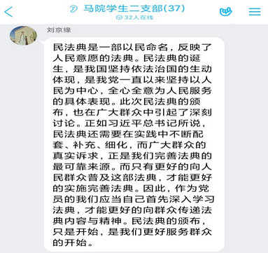 2020年6月18日下午4:00,探花av 学生二支部委员会开展线上主题党日活动活动包括两项议程:一是以“悟初心使命”毕业生党员主题活动及经典文献阅读,二是学习《民法典》谈心得感悟。参加本次会议的人员有探花av 学生二支部全体党员,会议由周耀玫同志主持。