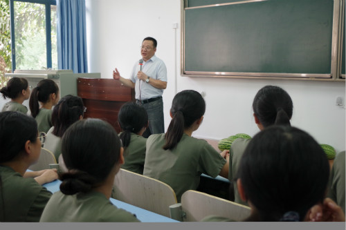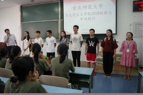 首先,刘军书记发表讲话。第一,对2018级新生表示热烈的欢迎。以大三年级考研事迹为例,希望同学们能拥有团结拼搏的精神;第二,对2018级同学表示慰问和问候。特别是外地同学要尽快适应重庆的气候,不畏高温酷暑,继续保持吃苦耐劳的精神,争取在汇演时表现出马院学子的风采。第三,军训是大学第一课,也是一种历练,相信为期半月的军训生活能让同学们终身难忘,也希望将这份力量和毅力带到整个大学生活中去。第四,预祝军训圆满成功,期待汇演时的飒爽英姿,希望同学们大学四年乃至今后依然如现在这样英姿勃发。紧接着,陈洪院长讲话。他讲到:一定要学好、领会好第一课,通过军训这个难关;他认为军训的目的是要同学们养成国防意识,而且一定要将良好作风延续到大学四年的工作、学习和生活中去;希望思想政治教育专业的同学能获得优秀联队的称号。最后,同学们以热烈的掌声欢迎高年级学姐学长的看望,并且领取西瓜、牛奶等慰问品。