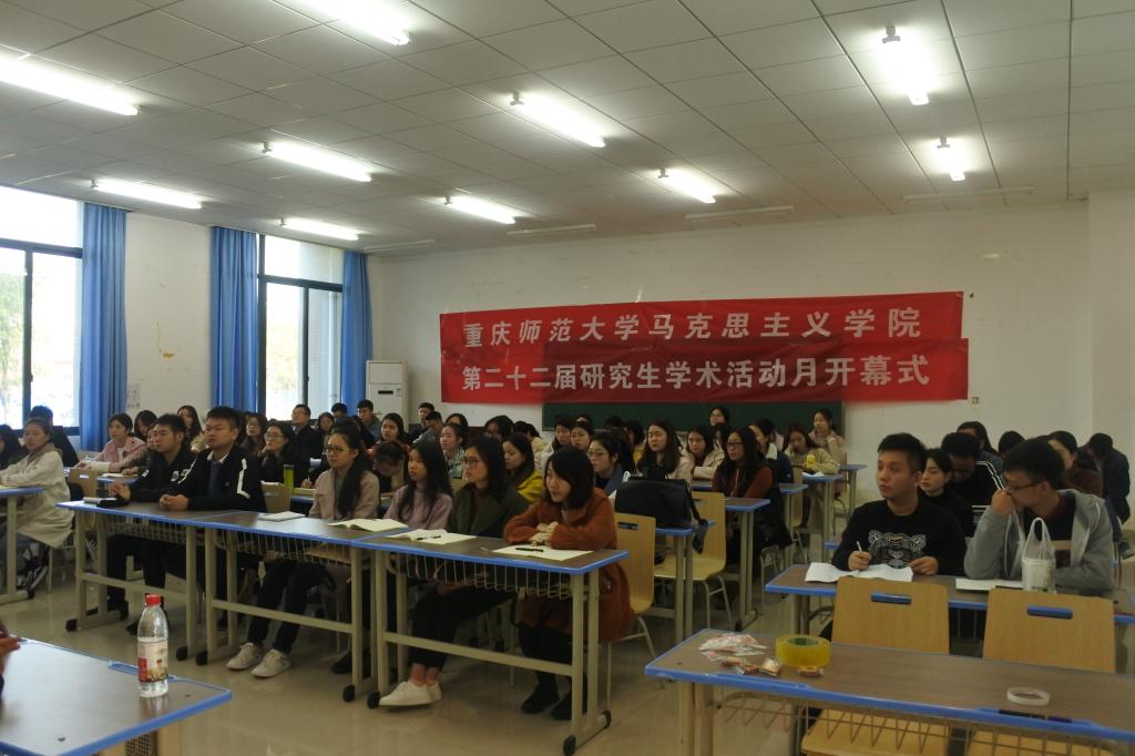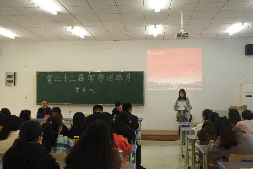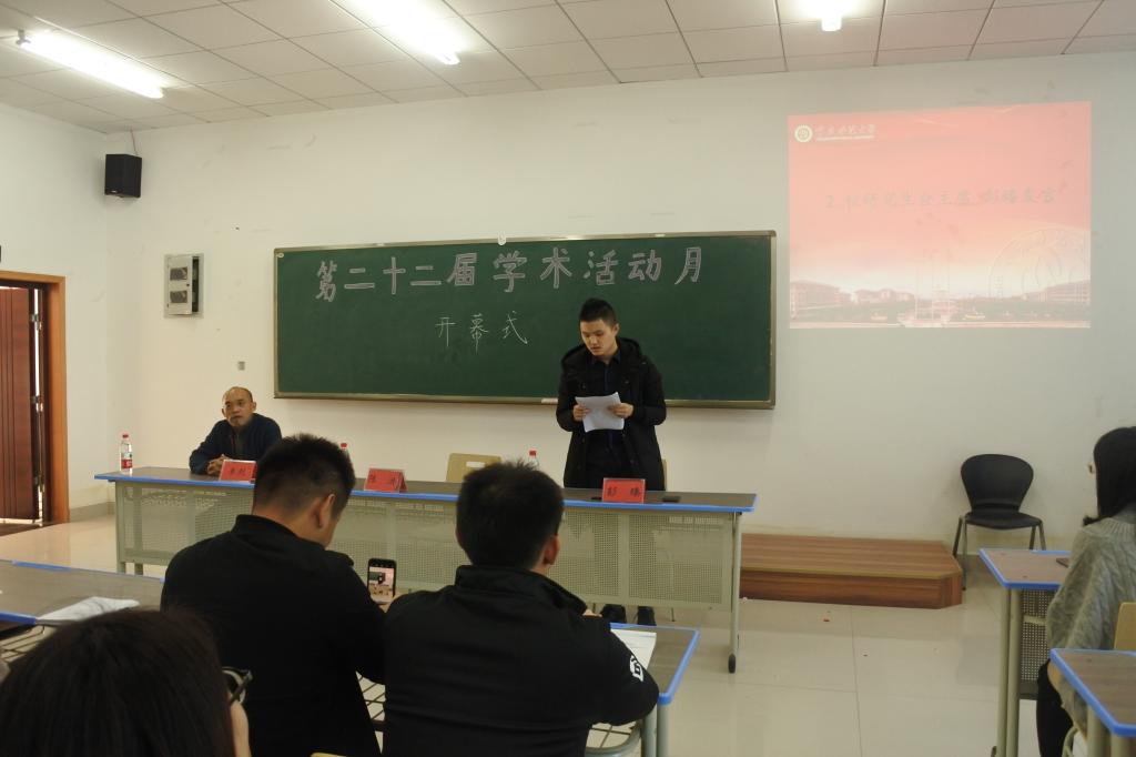 第二十二届研究生学术活动月开幕式在汇贤楼106召开。学院院长陈洪教授、研究生班主任李剑老师、校研究生会主席、学院2017级研究生彭臻同学以及2017、2018级全体研究生参加了此次开幕式。开幕式由2018级研究生唐婷同学主持。