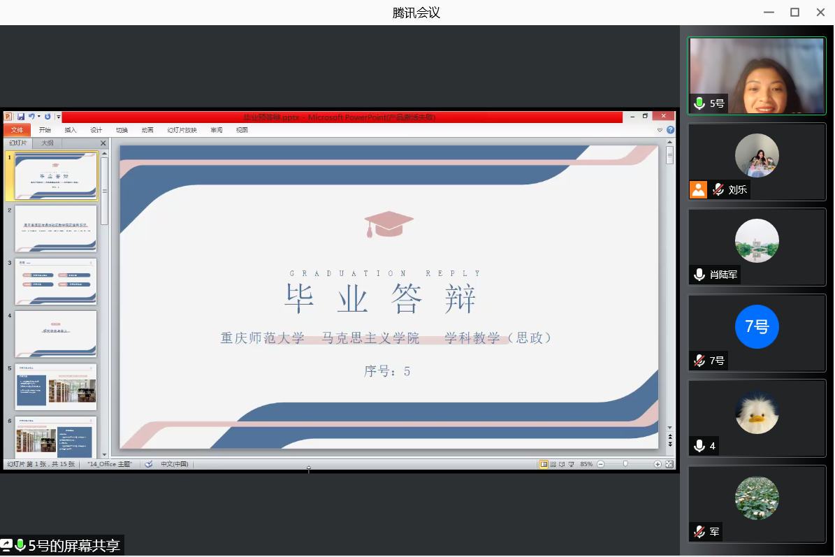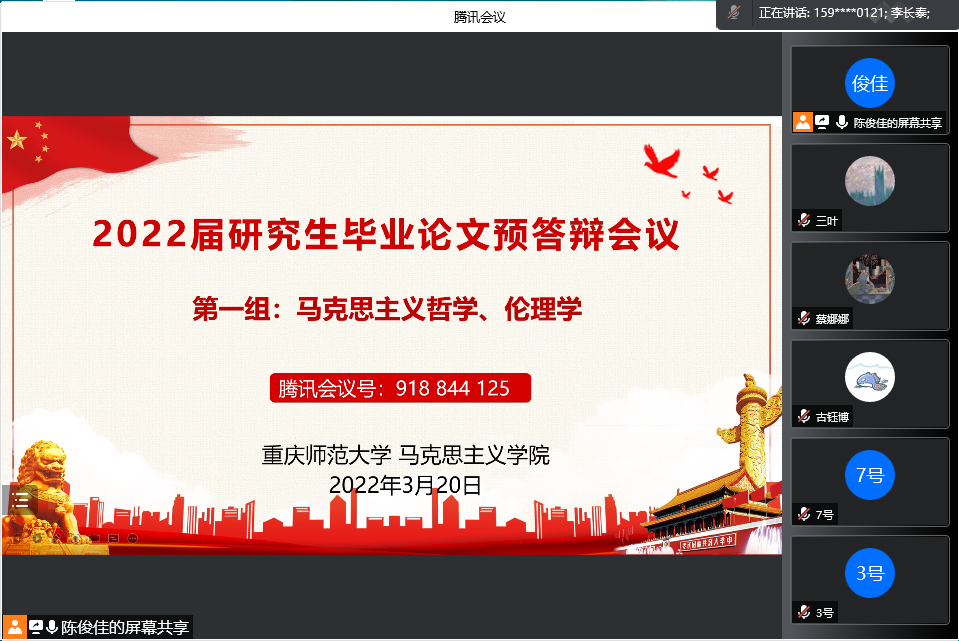 通过腾讯会议分别开展了2022届马克思主义理论类、哲学类学术型研究生和学科教学(思政)专业学位研究生的学位论文线上预答辩工作。会议分上下午两场,共12个小组,预答辩学生总人数为79人。