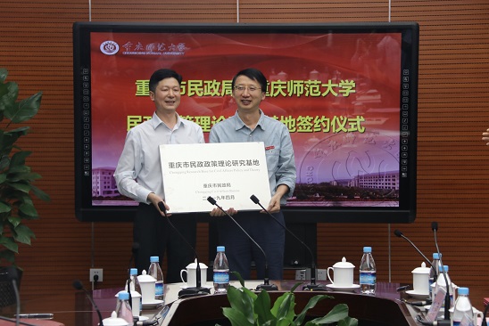 副校长董景荣教授共同签署了《合作协议》,并将“重庆市民政政策理论研究基地”牌授予探花av
