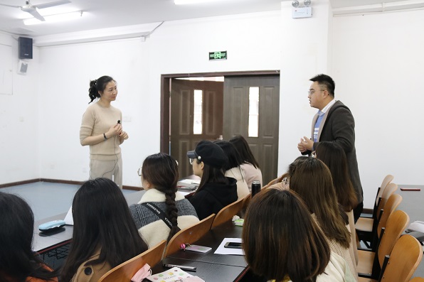首先,为让同学们对“体验式教学”有更为深入地理解,代老师结合自身教师职业生涯的经验,从教师主导、学生积极参与、加深学生印象和保持师生和谐关系方面入手,深入浅出地让同学们了解 “体验式教学”的含义和实施条件。接着,代老师将“体验式教学”与“传统教学”进行了比较,针对“传统教学”的课堂中普遍存在的浅表式教学和教学效果的片面性问题作了详细地分析,让同学们对实施“体验式教学”的必要性有了更加深刻的认识。她强调,就“体验式教学”的教学方法和教学设计而言,学生自身体验和对知识的生成性是教学重点。