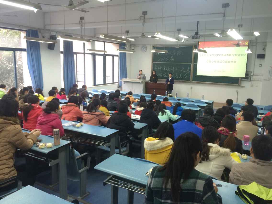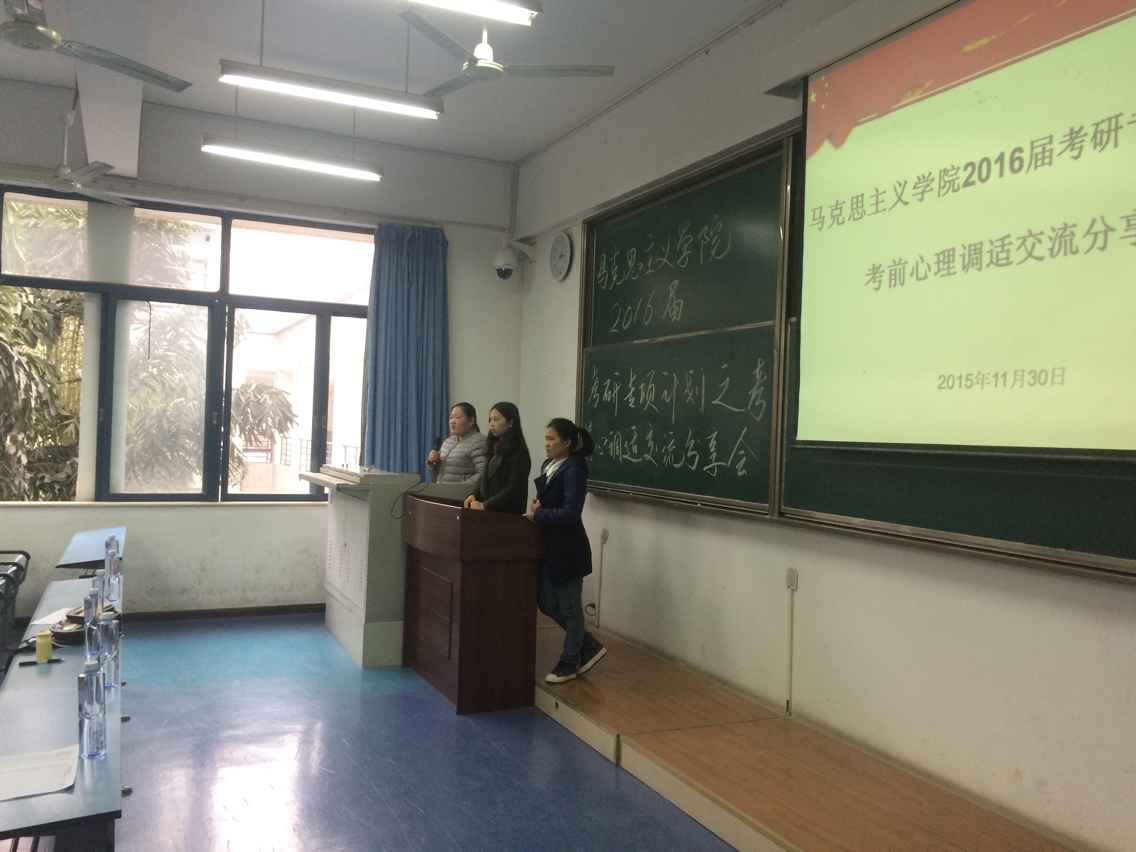 于弘德楼5401教室开展了考研专项提升计划之考前心理调适交流分享会。2011级优秀考研代表余维维、郝梅、张燕霞为主讲人,探花av
