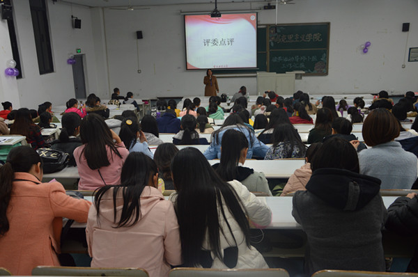 随后,评委代表赵艳华老师做了点评。她充分肯定了选手们精心准备,并鼓励大家深入阅读,做爱读书的马院人。最后,选手与评委合影留念,至此,持续3个半小时的比赛圆满结束。