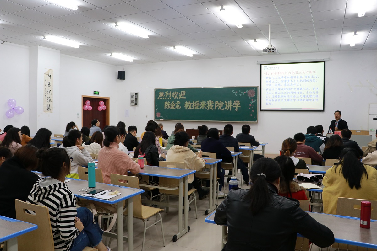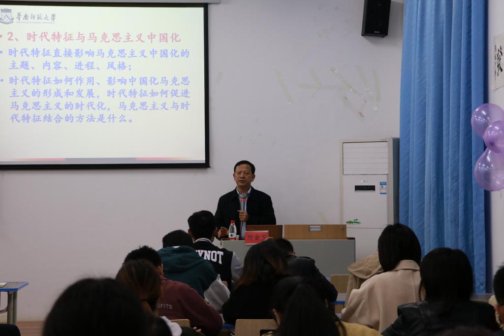 陈金龙教授以马克思主义中国化基本文献研究为切入点,简要介绍了马克思主义基本文献的翻译与传播、接受与提取、形成与传播情况,提出马克思主义基本文献是学科研究的前提,强调马克思主义基本文献的基础性作用,以及许多马克思主义及中国化马克思主义基本文献值得我们深入研究的问题。围绕本次讲座的主题,陈教授从马克思主义中国化的历史进程研究、核心概念研究、理论谱系研究、社会传播研究、基本理论研究、重大现实问题研究、海外评价与研究的审视方面展开深入论述。提出,核心概念是研究的载体,我们要注重概念在不同时代的含义及指向强调我们要关注重大现实问题重大理论问题、重大实践问题和重大经验总结,积极运用马克思主义视角思考现实问题、提升实践经验。最后,陈金龙教授分享自身治学经验,对在场同学提出要具备学术品质和道德品质、加强学术和科研意识、运用多学科的研究方法、形成有特色的固定研究领域及方向、从学术的维度思考现实问题、由模仿到形成自己的风格嘱咐。陈教授的报告视野宏思想深邃,视角独到,阐释充分,深入浅出,语重心长,师生带来了一场历史与现实、时间与空间、横向与纵向、国际与国内、理论与实践紧密结合的学术和精神大餐,赢得了师生们的广泛认同和高度肯定。