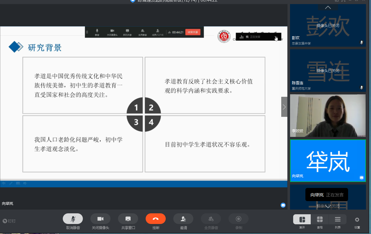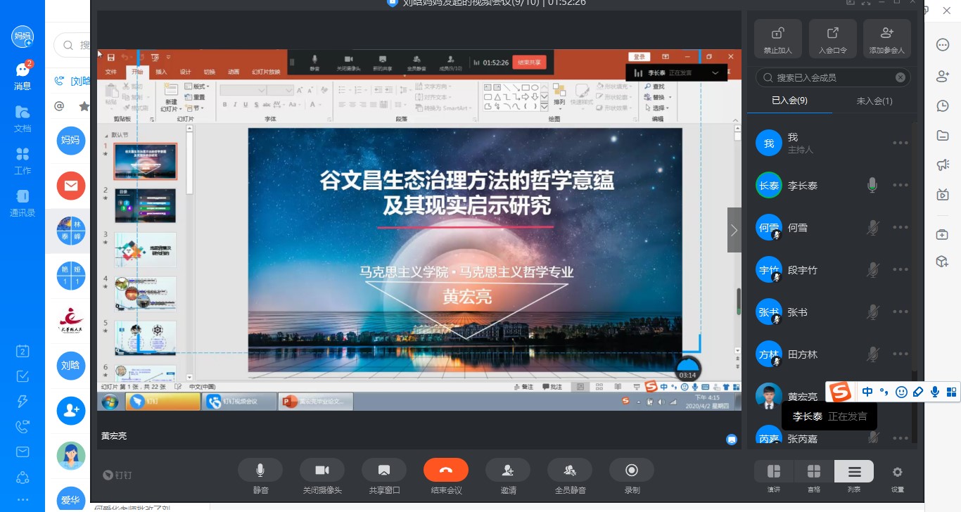目前正值新冠肺炎疫情特殊时期,为加强对毕业研究生学位论文的指导和管理,切实提高研究生培养质量,学院认真贯彻落实教育部和学校工作要求,切实担起责任,努力做到研究生学位论文与学位授予工作质量不降、标准不变、程序规范、方式便利。根据学校的要求和学院的安排,2020年4月2日、3日下午,我院采取钉钉视频会议的形式分别开展了2020届马克思主义理论、哲学学科学术型研究生和学科(思政)专业学位研究生学位论文线上预答辩工作。