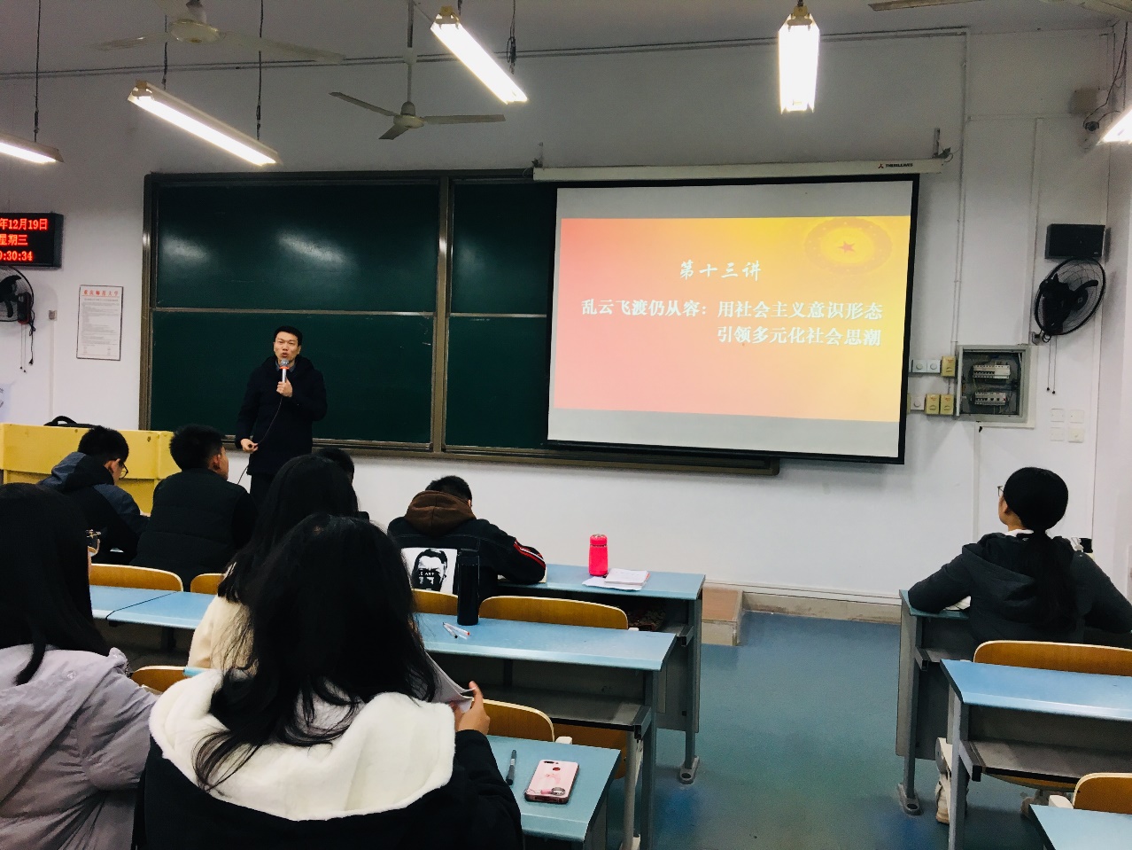党委副书记姜土生博士主讲,主题是“乱云飞渡仍从容:用社会主义意识形态引领多元化社会思潮”。此次讲课由思想政治理论课教研部主任孔庆茵主持。