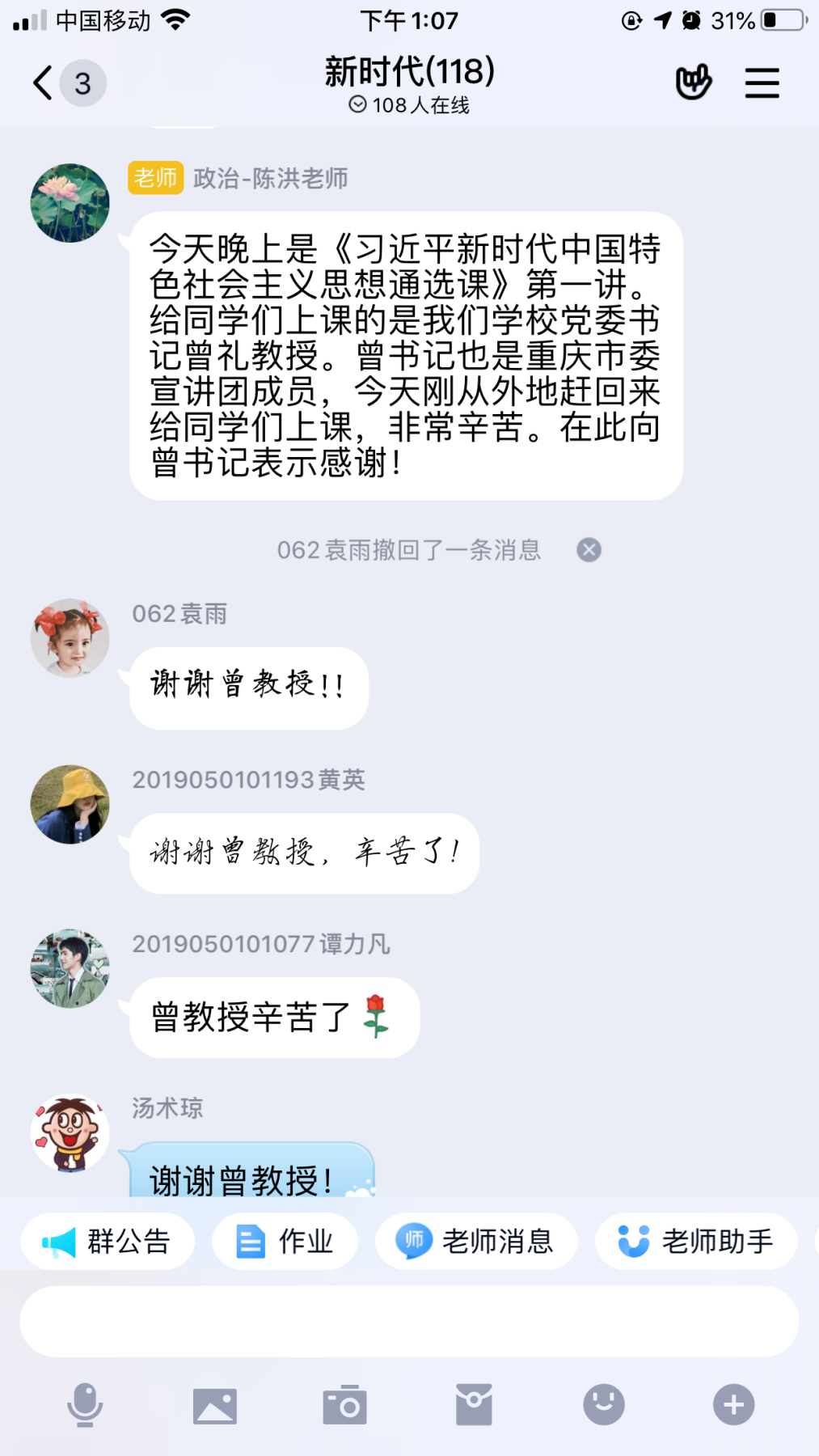 今年年初肆虐的新冠肺炎疫情,在以习近平总书记为核心的党中央的坚强领导下,全国人民团结一致,战胜此次疫情指日可待。鉴于此,高校都推迟了开学时间,但“停课不停学”的方式让同学们宅在家里也能完成相应的学习任务。《习近平新时代中国特色社会主义思想》从2018年9月开设以来已经完成了三期,这学期是第四期。校党委书记曾礼教授参加了每一期的授课,受到同学们的热烈欢迎和好评。为了准备好此次在线课程,曾礼教授多次在QQ群课堂直播进行设备的调试、资料准备等相关准备工作。同学们盼望已久的线上教学第一讲于2020年3月18日晚19时30分准时通过QQ群课堂录播形式开讲了。本次课程由探花av