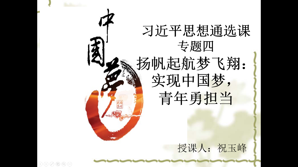 祝玉峰教授主讲,讲课主题为“扬帆起航梦飞翔:实现中国梦,青年勇担当”。本次授课采用了QQ群课堂直播的线上教学形式,选课同学按时、全部参与了此次线上教学活动。