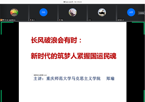 郑瑜副教授主讲,讲课主题为“长风破浪会有时:新时代的筑梦人紧握国运民魂”。本次授课采用了腾讯会议的线上教学形式,选课同学按时、全部参与了此次线上教学活动。