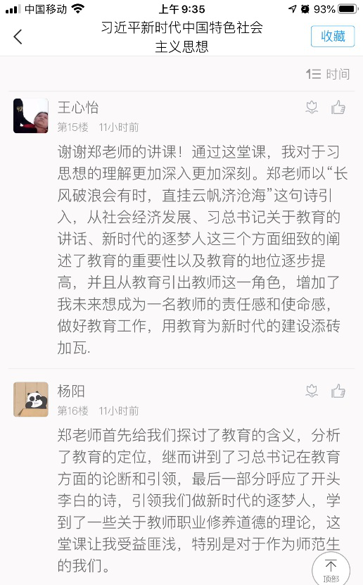 通过本次课程,有助于同学们培养责任感与使命感、坚定理想信念、成为一名优秀的人民教师。本次讲课,郑老师备课充分,PPT制作精美,讲课语言诙谐有趣、慷慨激昂,课堂气氛活跃,深受同学们欢迎。课后,同学们纷纷在网络平台上表达自己的看法。