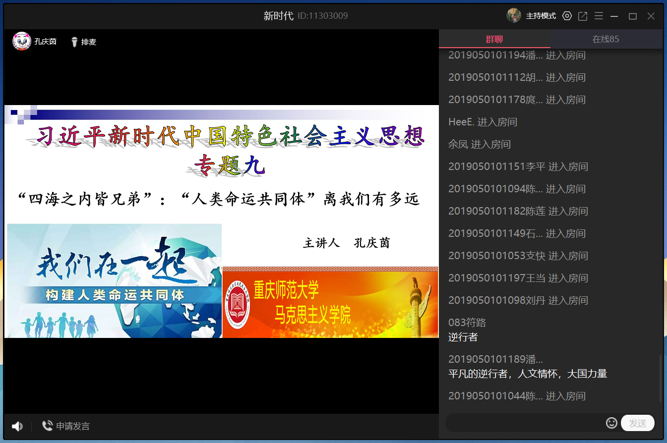 为深入学习习近平新时代中国特色社会主义思想,帮助学生更好地了解“人类命运共同体”并学会打造生活中的各种命运共同体,2020年5月13日晚,我校开展的全校通选课《习近平新时代中国特色社会主义思想专题摘编》第四期第九讲由探花av 孔庆茵副教授主讲,讲课主题为“四海之内皆兄弟”:“人类命运共同体”离我们有多遥远。本次授课采用了QQ群课堂的线上教学形式,选课同学按时参与了此次线上教学活动。