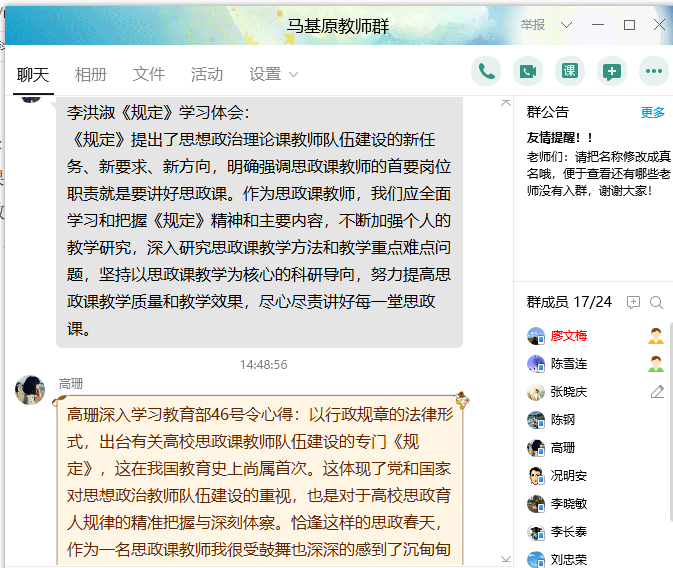 思想政治理论课教研部主任孔庆茵老师认为学习“规定”之后,很受鼓舞,明白肩负的担子更重,需要不断努力、不断奋斗,才能无愧于党和国家交给的光荣使命,落实立德树人根本任务,培养三观正确的社会主义建设者和接班人。