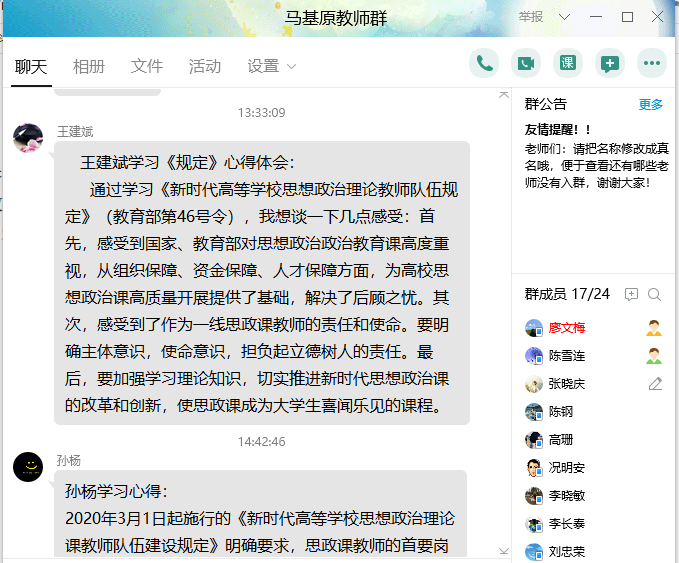 学习讨论结束后,各教研室还开展了集体备课。针对疫情期间线上教学情况,大家就线上课程教学中的做法、心得、亮点,目前的教学进度、专题教学中的重难点,以及线上教学中存在的困难和问题进行了深入交流,分享了开展经典文献阅读、深化课堂学习、布置平时作业、拓展学习内容等经验做法。
