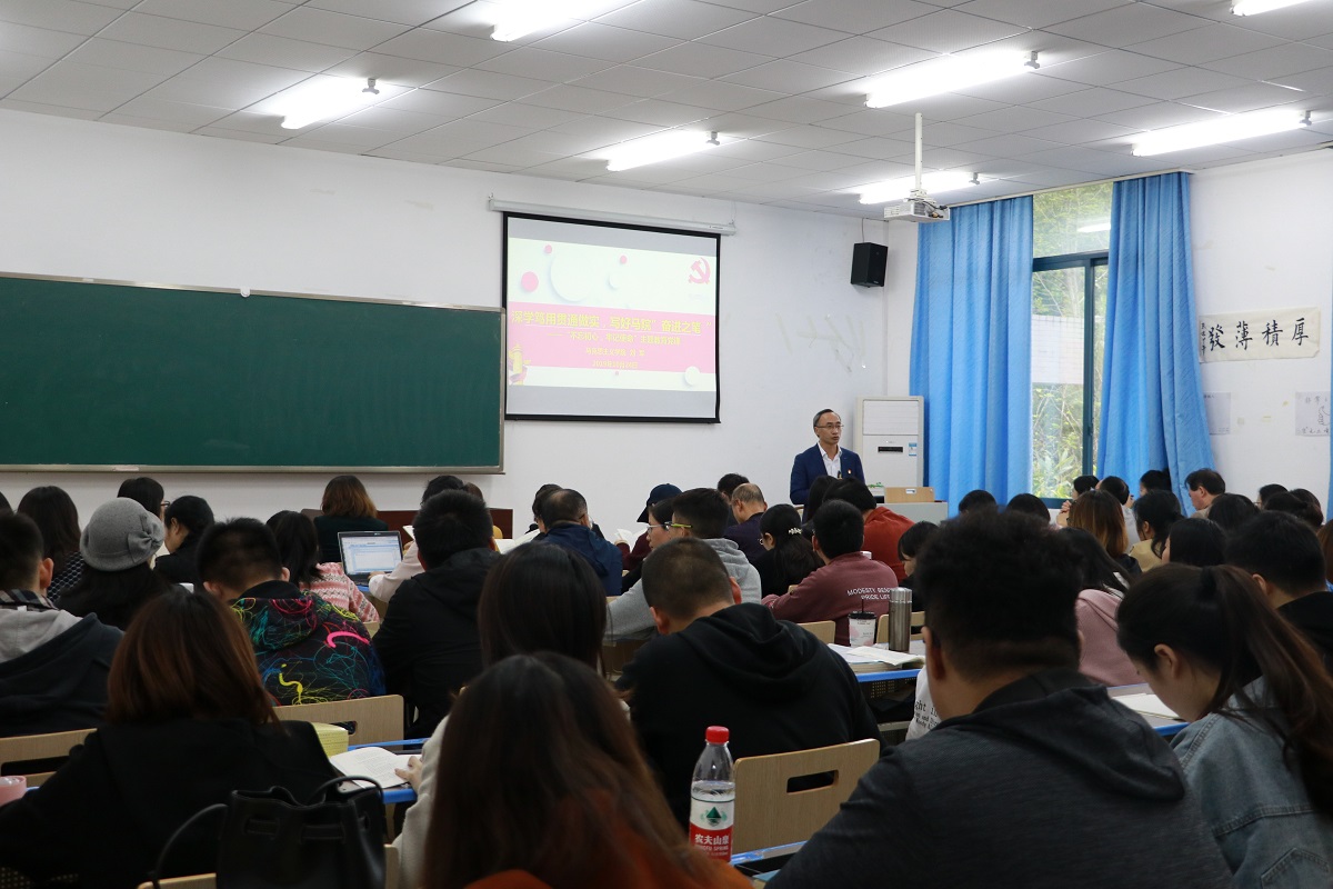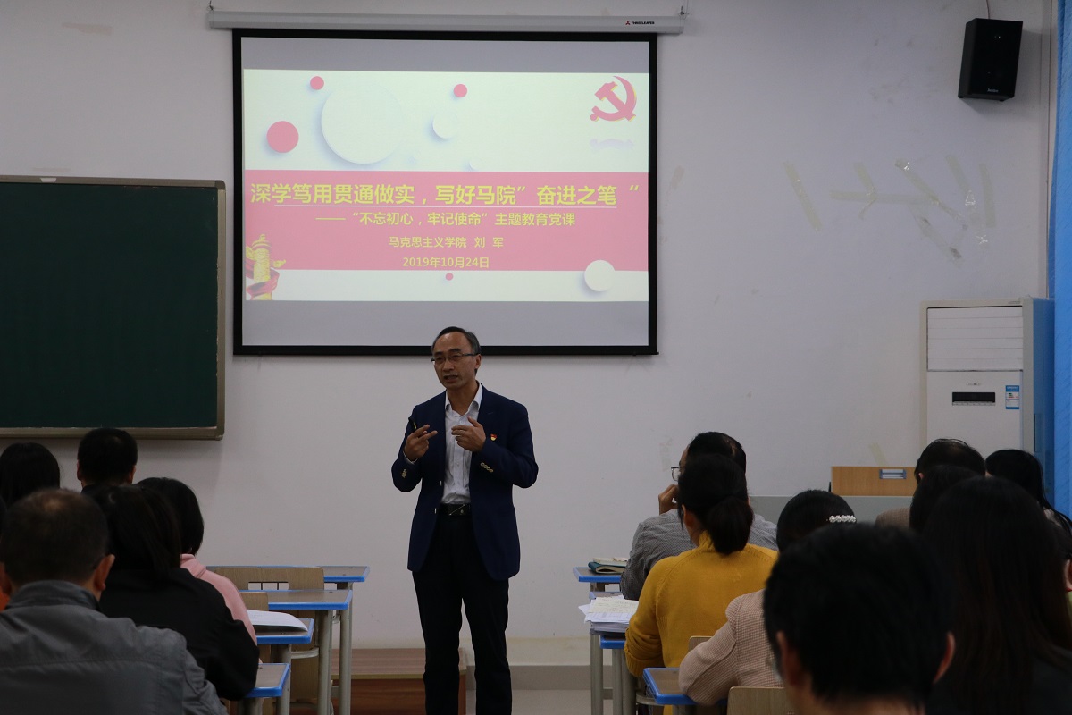 党课以“深学笃用贯通做实,写好马院奋进之笔”为主题。围绕主题,刘军书记从“为什么出发?——习近平之问”“两个一百年奋斗目标的提出及现实阶段”“正当其时”三个背景导出讲课内容。接着,刘军书记以“教育和教师的使命责任、高校的办学性质、高校培养人的根本问题、高校教师的要求、思想政治理论课教师要求及青年学生寄语”等内容为重点,系统讲述习近平总书记“立德树人”重要讲话和重要论述的精神实质。最后,刘军书记结合“不忘初心、牢记使命”主题教育宗旨给听课的师生共同分享了学习体会:学做贯通,知行合一;认真检视,着力整改;身体力行,共谋发展;紧抓机遇,砥砺奋进。他倡导:每一名教师要以习近平总书记讲话精神为指导,将培养担当民族复兴大任的时代新人、培养德智体美劳全面发展的社会主义建设者和接班人为己任;每一名党员要牢记习近平总书记的嘱托,不忘初心,砥砺前行,带头以身作则,将人生理想融入国家和民族事业中。同时,希望全院师生以主题教育为契机,团结一致,共同奋斗,形成马院最大公约数,画出马院最大同心圆,共同书写好马院“奋进之笔”。