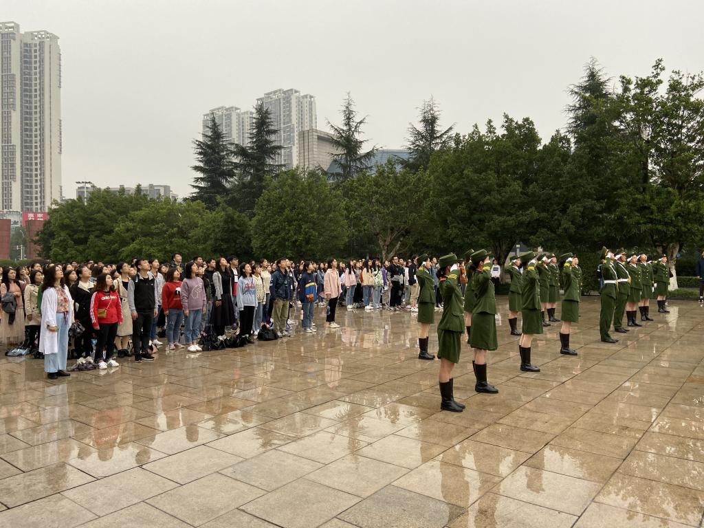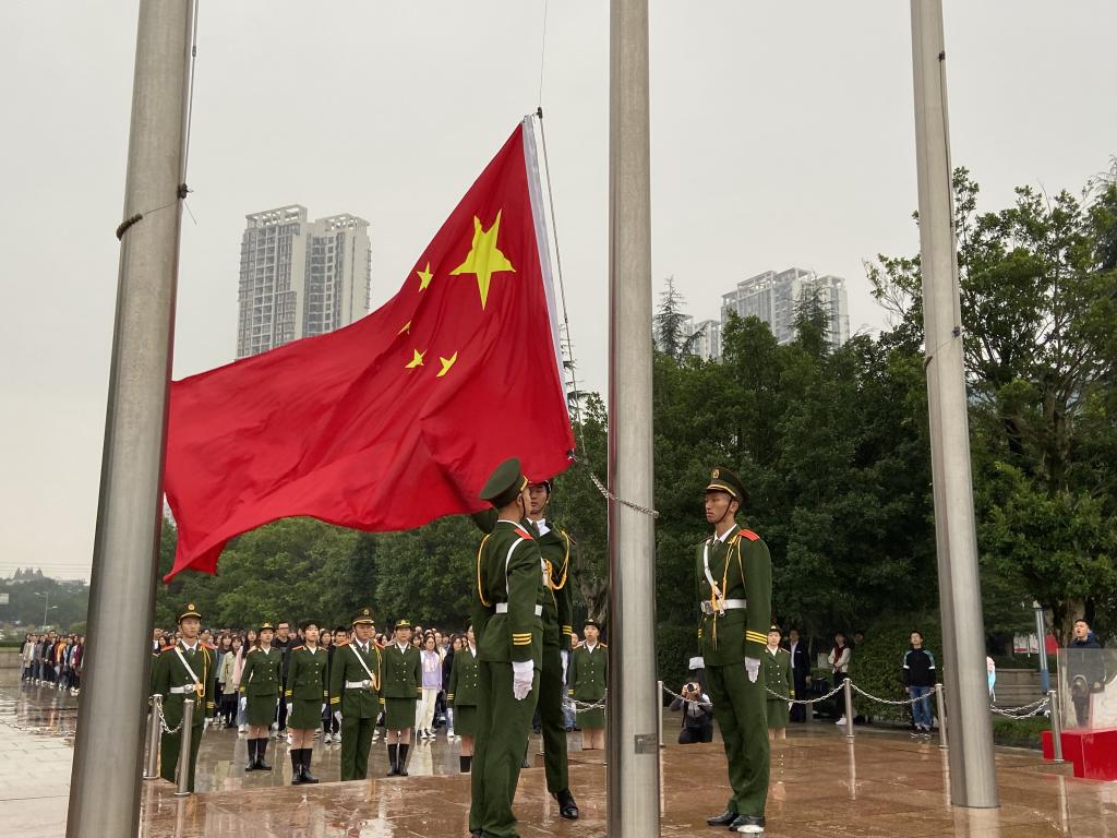 上午7:45分,学院师生在雨中列队完毕。学校国旗护卫队队员迈着整齐的步伐护送国旗走向升旗台。当《义勇军进行曲》奏响,师生们全体肃立,齐声高唱国歌,向鲜艳的五星红旗行注目礼。