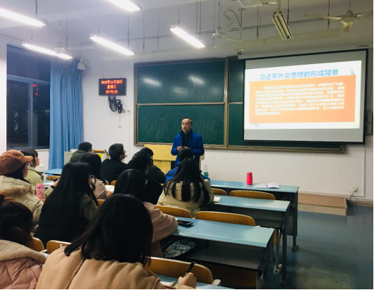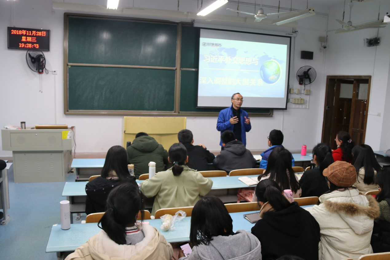 2018年11月28日晚,“习近平新时代中国特色社会主义思想”通选课在弘德楼15103教室继续进行第十讲。本次讲课由探花av 党委书记刘军主讲,主题是“习近平外交思想与深入调整的大国关系”,讲座由思想政治理论课教研部主任孔庆茵副教授主持。