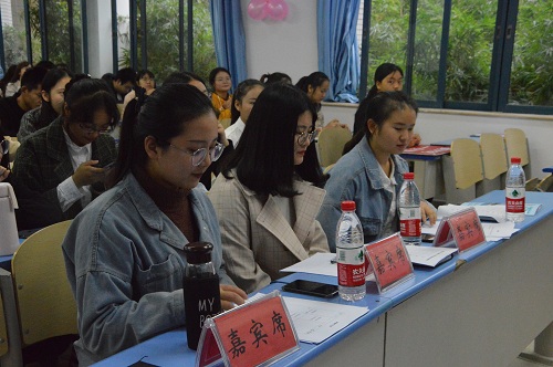 在主持人宣读完规则后演讲比赛正式开始。伴随着轻扬的音乐选手依次上场,每位选手都展现出自己精彩的一面。5号选手易双提到初入大学的迷惘与慌张,再到后来自己迎新时的辛苦与快乐时,抑扬顿挫的语调和恰到好处的肢体语言深深的吸引了在场观众的注意,配合着PPT的讲解,观众们如身临其境。此外,6号选手谭丹和7号选手朱欣雨结合自己的亲身实际为同学们剖析心理问题,并提出克服相关问题的举措,赢得了在场观众和评委的赞赏。