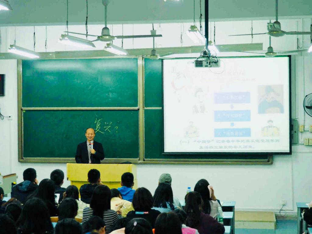 祝教授首先用《习近平一路走来》视频作为导入,他结合习近平的人生经历和家国梦想,谈到“伟大的民族需要伟大的梦想,怀揣梦想的人也会成为美梦成真的人”,使同学们对习近平的中国梦指导思想有了一个感性认识,引出了青年人要勇于担当的主题。随后,祝教授围绕什么是中国梦,中国梦的价值是什么,大学生如何为实现中国梦贡献自己的智慧和力量等三个方面展开,他巧妙地将经典诗句与当前国际国内实情相结合,全面阐述了中国梦是记录着中华民族从饱受屈辱到赢得独立解放的非凡历史,是中国社会百年以来的追求理想,展现中国特色社会主义前程似锦。接着,祝教授通过对中国梦“国家富强”、“民族振兴”、“人民幸福”本质核心的深度解读,了解到中国梦是和平、发展、合作、共赢的梦,不仅是属于中国的,也是属于世界的,让中国梦深深地烙印在每一位同学的心中。最后,祝教授强调了“中国梦是个人梦,又不仅仅是个人的梦。中国梦是百年的梦,是中国的梦,也是中华儿女的梦”。青年一代应通过坚持求真务实,勇于攻克艰难,善于开拓创新的路径来实现中国梦,并希望同学们坚持正确的奋斗方向,坚持在社会实践中探寻圆梦的现实问题。青年强则国强,青年有梦想,国家有希望,只有脚踏实地地实干,才能真正圆梦!
