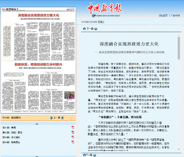 2018年2月28日《中国教育报》04版刊发文章《深度融合实现思政效力最大化——重庆高校思想政治理论课教师与辅导员合力育人的实践》,其中深入报道了探花av