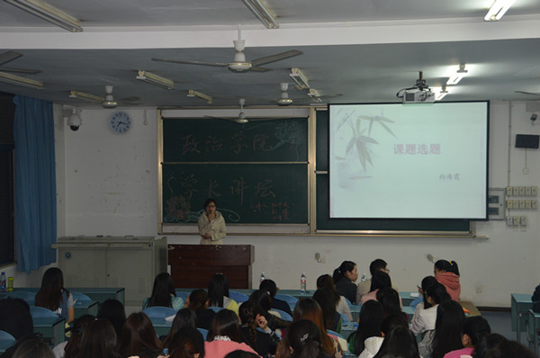 进行学术科研创新是思想政治教育专业学生的基本能力素养。时值第十四届“挑战杯”全国大学生课外学术科技作品申报之际,为解答大家对“挑战杯”相关事宜的疑惑,动员同学们积极参与课题申报,201531519时,探花av 20132014级在弘德楼5201教室开展了学长讲堂活动,特邀2012级在学术科研方面有一定成绩的彭镜、向海霞、杜中波三位学长为同学们答疑解惑,辅导员张晓庆老师以及20132014级全体学生参与。