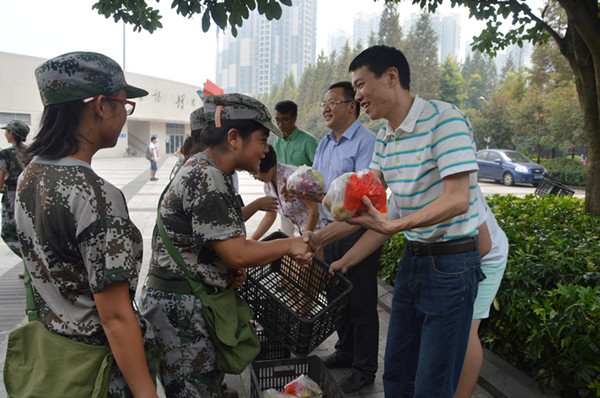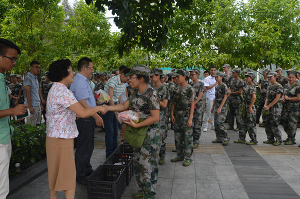 院长陈洪、党委书记万朝晖、党委副书记姜土生及2015届辅导员马小又一行人来到重师体育馆,关怀慰问正处于军训阶段的2015届全体新生。