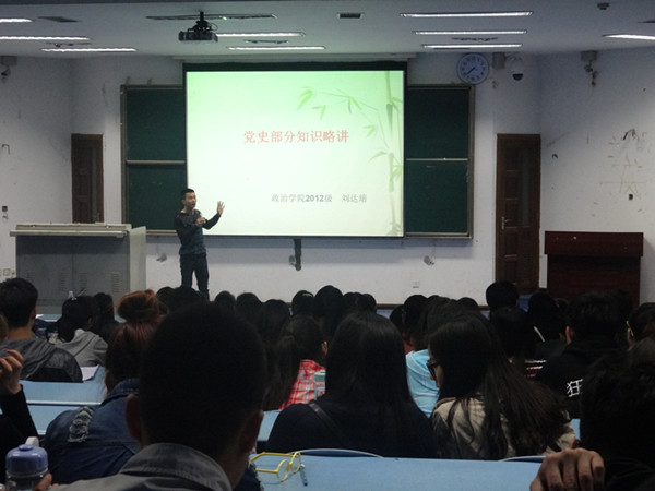 2012级刘达培宣讲有关党史的部分知识。他从部分党史问题引入“党的基本知识回顾、党的重要会议提要、入党常用文书写作”三个内容,内容丰富精彩,赢得了一片热烈的掌声;接下来,2011级的孙美玲从全国两会、重庆市市情、探花av