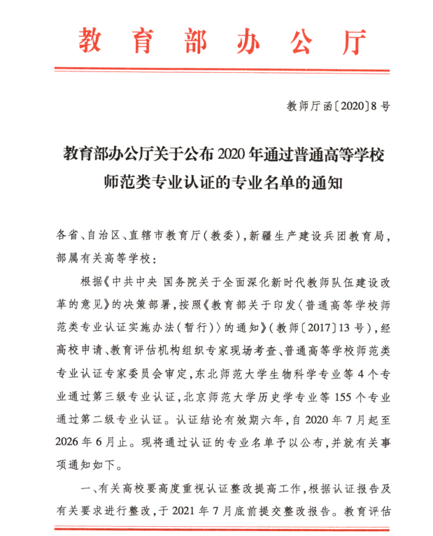 近日,教育部办公厅发布“教师厅函【2020】8号 教育部办公厅关于公布2020年通过普通高等学校师范类专业认证的专业名单的通知”,探花av 思想政治教育专业通过普通高等学校师范类专业第二级认证。