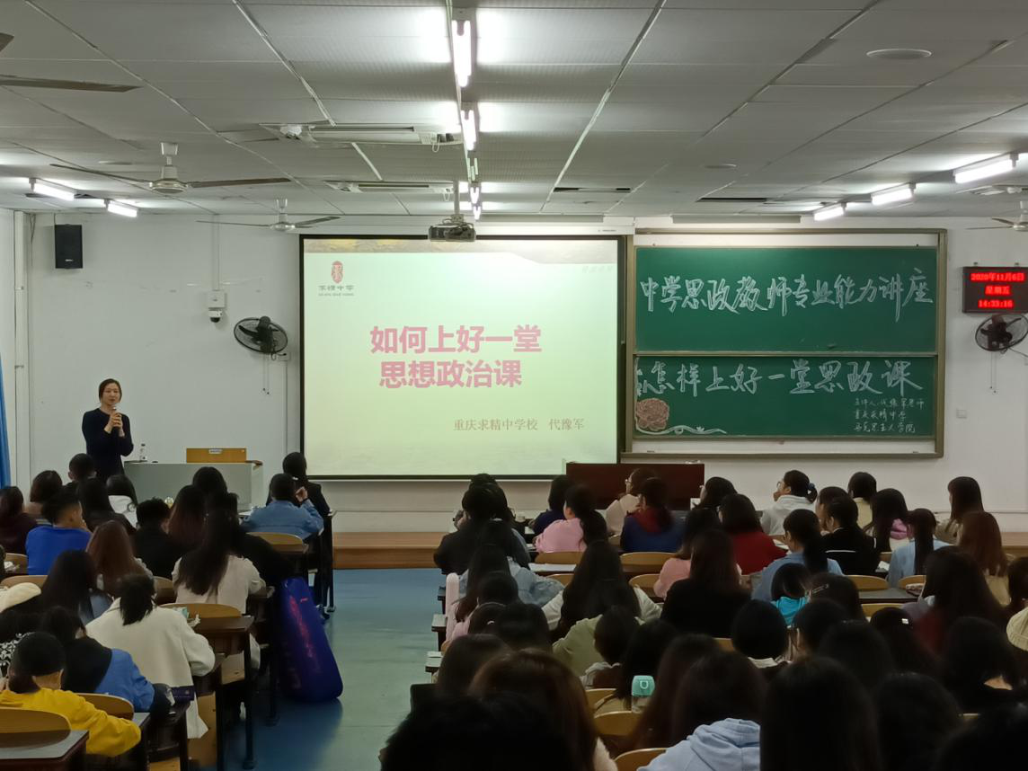 举办中学思想政治专业能力培养系列讲座第二讲,邀请重庆求精中学校政治教研组长,教育部“一师一优课,一课一名师”活动“优课”评审专家代豫军老师在砺志楼2505为2018级思想政治教育专业本科生和2020级学科教学(思政)研究生带来一场题为“怎样上好一堂思政课”的专题讲座。探花av