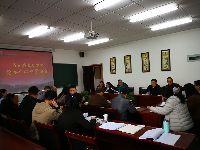 委员会思想政治理论学习实施办法》的主要精神,分别从总则、学习组织、学习内容及形式、学习管理、督查与考核、附则等六个方面向大家做了学习和介绍,尤其是学校党委对思想政治理论学习的学习对象、学习内容、学习形式和学习要求进行了详细的解读,他强调希望大家通过实施办法的学习深刻认识思想政治理论学习的重要性,从思想认识、行动落实都要到位;接着全体成员观看了《习近平为第五批全国干部学习培训教材作序》视频新闻,进而学习了习近平总书记的序言全文,认真领悟了加快推进马克思主义学习型政党学习大国建设的重要意义;最后,刘军书记传达了学校近期开展的“安稳工作会暨2019年度上半年意识形态工作会”精神,强调大家要在灵魂深处高度重视思想政治学习和意识形态工作,准确研判和把握今年整体工作形势,努力做到增强“四个意识”、坚定“四个自信”、做到“两个维护”。