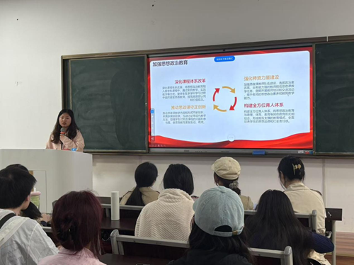 随后,三位党员同志依次进行全国教育大会精神、重庆市教育大会精神的学习分享。杜梦玲同志领学全国教育大会精神中的立德树人根本任务和教育强国战略目标,并清晰阐述了教育改革与发展的方向;曹静同志从实施立德树人工程、加强教师队伍建设、鼓励社会力量参与以及应对未来挑战这四个方面,与同志们进行充分学习与探讨;刘倩倩同志领学重庆市教育大会精神。最后,谭景文同志对本次主题党日活动进行总结,要求全体党员认真学习领会、深入贯彻落实相关会议精神,深刻领悟 “两个确立” 的决定性意义,不断增强 “四个意识”、坚定 “四个自信”,切实做到 “两个维护” 。