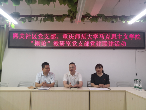 “概论”教研室党支部与虎溪街道熙美社区党支部于2025年6月10日上午9:30在熙美社区三楼会议室开展党建联建活动。学院党委副书记方敏、“概论”教研室党支部书记郑瑜、熙美社区党支部书记王毅、“概论”教研室党支部教师党员代表及熙美社区党支部党员代表参加本次活动。