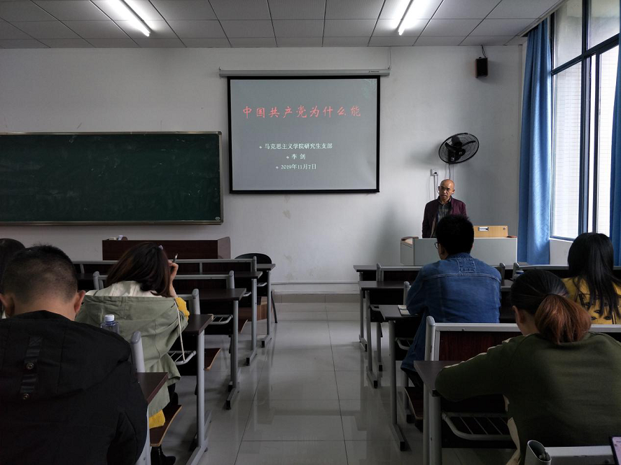 十九大以来,习近平总书记反复多次强调“不忘初心、牢记使命”,坚持为中国人民谋幸福、为中华民族谋发展。我们的党之所以能,关键在于有坚强的领导核心和坚定不移的信念。然后,李剑老师从目标、机制、成员、行动四个方面的统一对党课的主题进行了总结,使我们深刻理解了中国共产党砥砺前行,创造奇迹的本质原因。