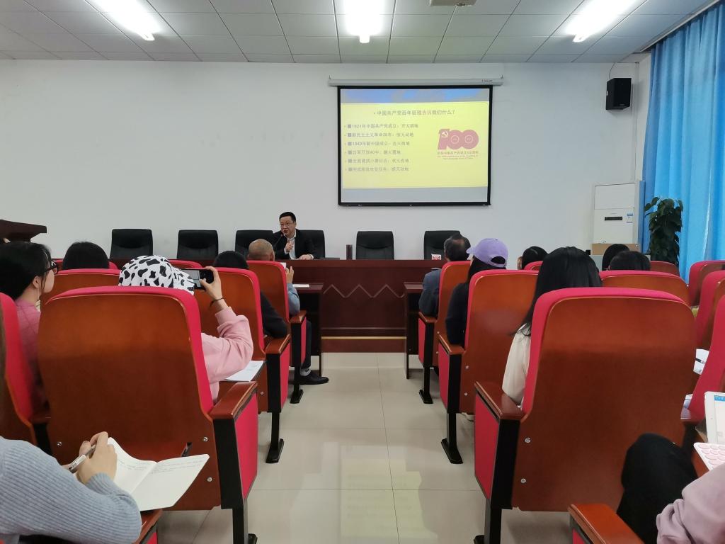 紧接着陈洪教授作了题为《学习中国共产党历史要把握的几个重点》的党史专题讲座。开篇用把握基线和阶段、把准主题、把稳主线等“七个把”,深入浅出地提出了学习党史的重点方向。接下来陈洪教授分享了学习党史的要诀,“线、点、面、启”四位一体,做到理清历史脉络、弄准基本史实、拓展历史深度、做到以史为鉴。在讲座中,陈洪教授通过几则生动的党员故事说明了为什么群众路线是党的生命线和根本工作路线。最后,陈洪教授就学习党史提了几点建议,要沉下心来“学”、静下心来“思”、安下心来“悟”、捧出心来“做”,只有做到了这四个“心”,党史学习才能真正促进青年党员的发展进步。
