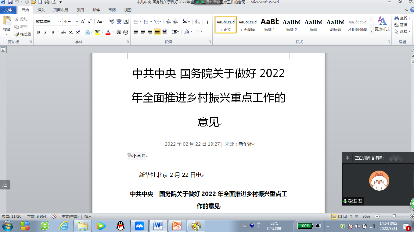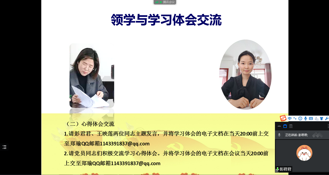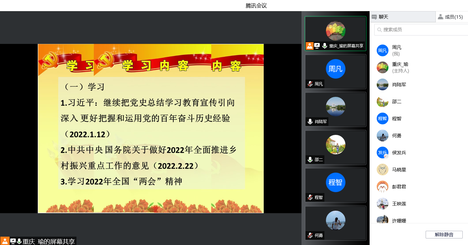 “概论”教研室党支部通过腾讯会议召开线上支部党员大会,组织开展3月主题党日学习活动,重点学习了2022年1月11日习近平总书记在省部级主要领导干部学习贯彻党的十九届六中全会精神专题研讨班开班式上发表的《继续把党史总结学习教育宣传引向深入 更好把握和运用党的百年奋斗历史经验》重要讲话,以及《中共中央国务院关于做好2022年全面推进乡村振兴重点工作的意见》主要精神。会上,彭君君和王映莲两位同志从乡村振兴战略的时代背景、机遇挑战、具体举措和重要意义等方面交流了学习心得,祝玉峰等同志踊跃发言,谈了各自的学习体会。通过学习,全体党员加深了对党的百年奋斗历史以及乡村振兴战略的理解和把握,为进一步提升课堂教学质量打下了坚实的基础。