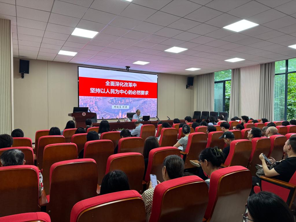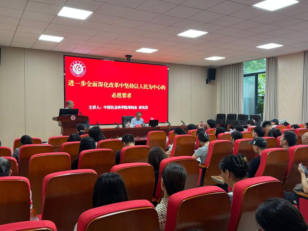 特邀中国社会科学院邓纯东研究员在学院106会议室作题为《进一步全面深化改革中坚持以人民为中心的必然要求》的党员学习教育专题讲座。讲座由副院长田方林教授主持,全院教职工及学生党员代表到场聆听学习。