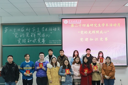 第二十四届研究生学术活动月“党的光辉照我心”党建知识竞赛在求是楼127教室成功举行。2019级研究生参赛代表及2020级全体研究生参加本次活动,活动由卢晓琳同学主持。