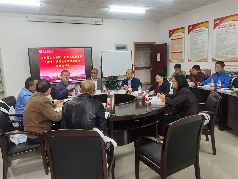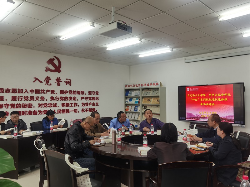 会上,况明安副院长对参会领导和老师进行了介绍,并向与会人员介绍了备课会的目的和要求。接着,与会人员集体研讨了党史、新中国史、改革开放史、社会主义发展史的开课时间和开课方式,校级通识选修课开课计划的填报,并明确了“四史”教学内容,课程教学大纲、教案、课件制作等相关任务。最后,历史与社会学院副院长陈太红发言,他强调了“四史”系列校级通识选修课的重要性,提高了大家对在全校开设“四史”系列校级通识选修课重要意义的认识。
