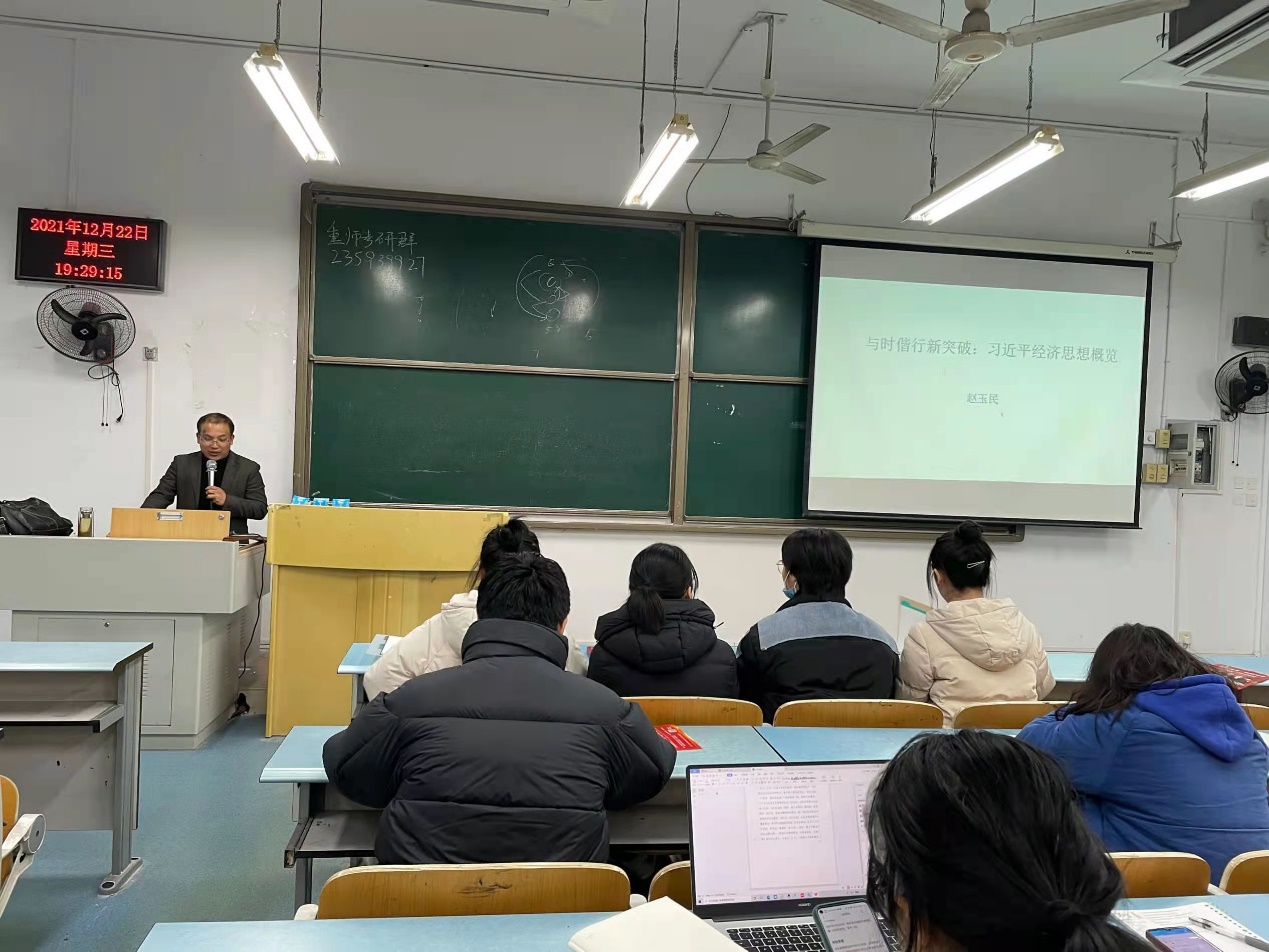 2021年12月22日晚,赵玉民副教授主讲的《习近平新时代中国特色社会主义思想专题摘编》通选课第七期第十四讲开讲,各学院各年级150余名学生参加了本次课程学习。本次授课由本通选课课代表万莹莹主持。