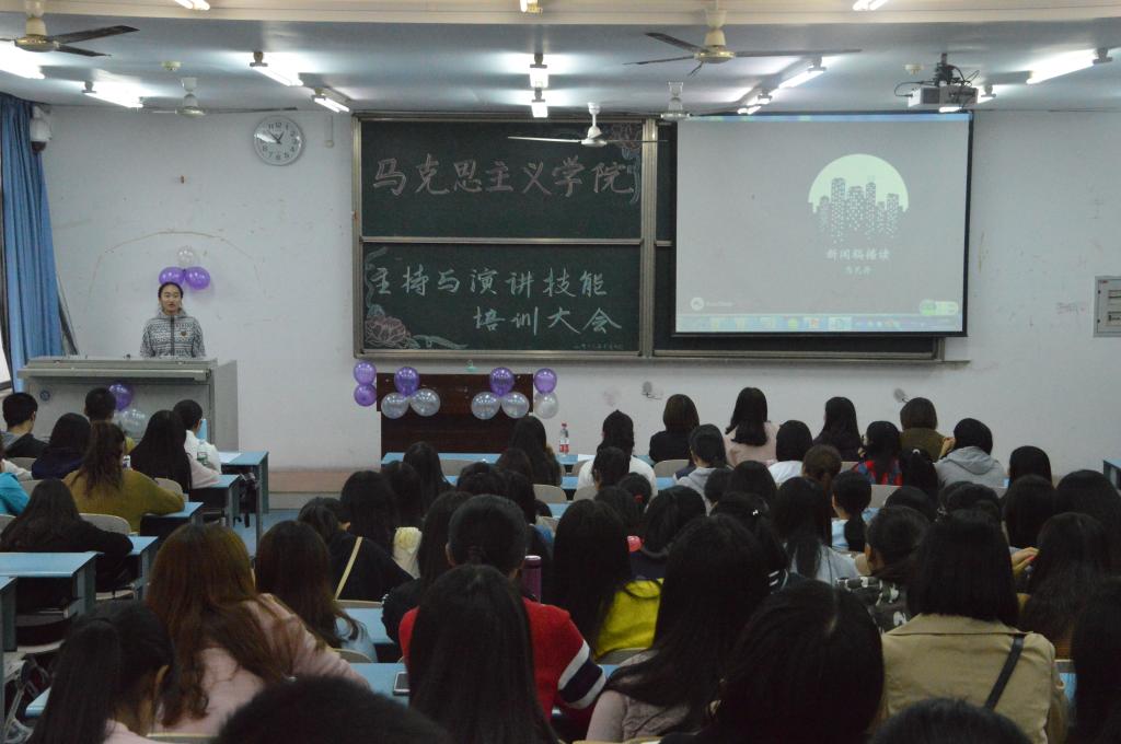 于弘德楼5202教室举行了主持与演讲技能培训大会。我校探花av广播电台播音员马艺丹、传媒学院文娱部部长孙路路、马克思主义学院学生会主席马涛以及学生会办公室副主任罗颖、出镜记者李阳悦心出席了本次培训大会。2016级全体学生参与。