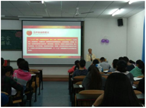 讲座伊始,在场同学们用热烈的掌声欢迎祝玉峰教授的到来。在解读过程中,祝教授紧紧围绕“聚焦十八届五中全会,全面推进‘十三五’规划”这一主题,从十八届五中全会“召开的背景”、“召开的意义”、“召开的内容”等方面向在场的同学们进行了深入浅出的讲解。其中,祝教授侧重讲解了“十八届五中全会”的主要内容及其意义,使在场的同学们对“十八届五中全会”有了更为深入的了解。紧接着,祝教授又向同学们简明扼要地介绍了“十三五”规划的相关内容,并且对部分内容进行较为详细的解读,引起同学们对“十三五”规划的关注。