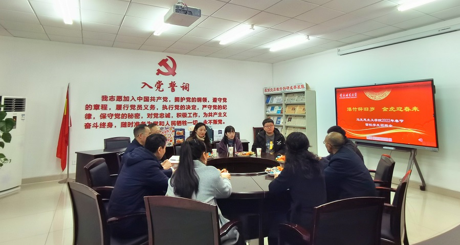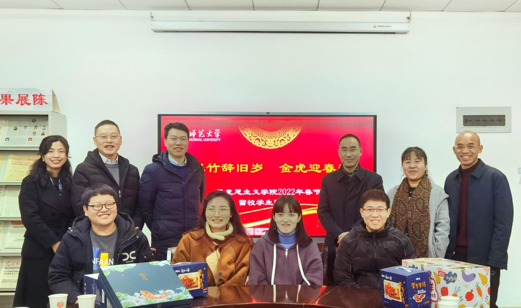 师生同聚一堂,畅聊自己的假期生活及未来的打算。留校的四位同学或因疫情不能回家,或因个人原因不能回家,但无论什么原因,几位同学都对自己在学校度过的这个特别的假期有自己的打算,临近毕业的黄丹、王志伟和王学前三位同学希望好好利用假期准备各种招聘考试及面试,多看书,努力完成毕业论文;研一的位明媚同学则计划在假期多读书,夯实一下理论基础,同时好好准备写论文。老师们听到同学们的假期计划都很欣慰,纷纷表达了自己的祝福和期望。李晓燕书记代表学院党政及全体老师对留校学生及其家人送上最诚挚的祝福,同时希望同学们在休息与思念中努力奋斗,充分利用假期的时光努力夯实基础,认真学习,积极为未来做准备,“团聚最喜悦、团圆最幸福、团结最有力”,希望留校的几名同学互相帮助、互相关爱,即使远离亲人,也能过一个幸福快乐的中国年。姜土生副院长希望同学们好好珍惜留校时光,努力提升自己,同时也提醒同学们注意各种安全,保护好自己的同时也不要忘记问候家人,珍惜亲情。侯玲副院长则从责任意识、公民意识、平安意识和健康意识等“四个意识”叮嘱同学们过一个温暖、安全、祥和的中国年。方敏副书记向同学们再次强调了疫情防控安全、消防安全等问题,希望同学们在校一定要遵守校规校纪,祝愿同学们度过一个“安全、安心、安逸”的春节。辅导员李剑和刘洪两位老师也纷纷为同学们送上了温暖的祝福。