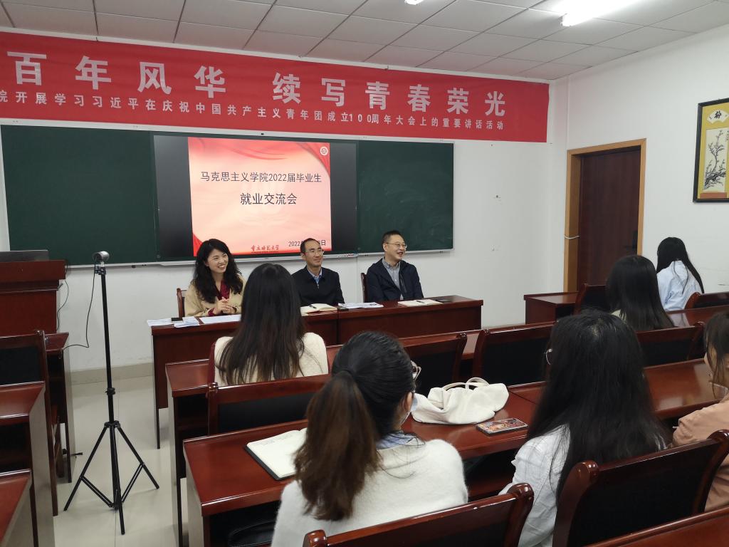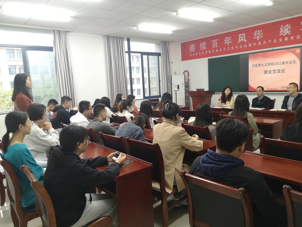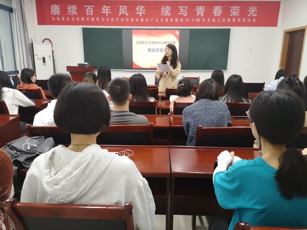 于汇贤楼309教室开展2022届毕业生就业交流会。学院党委书记李晓燕,党委副书记方敏、2022届毕业年级辅导员刘洪以及部分毕业生参加本次座谈会,因疫情原因,会议采用线上线下方式同时进行。