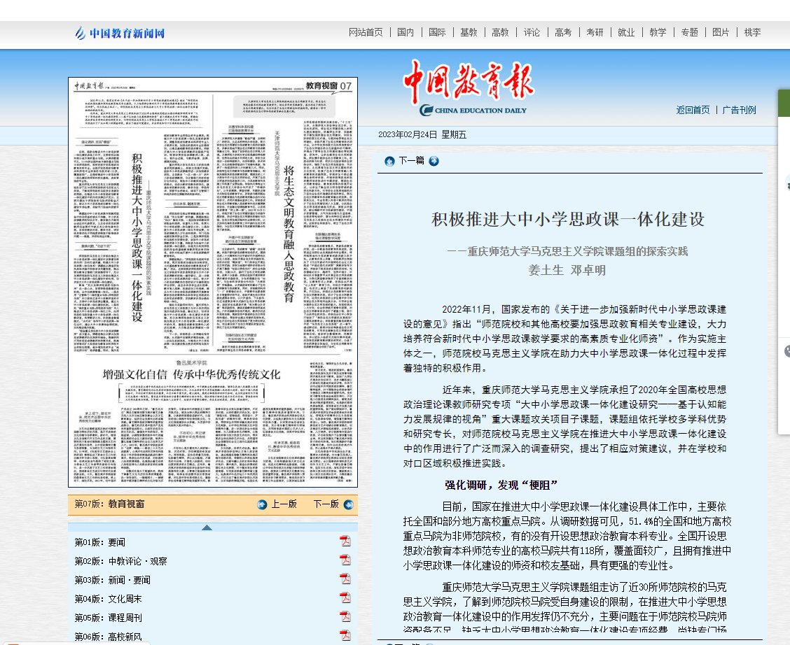 中国教育报:积极推进大中小学思政课一体化建设——探花av 课题组的探索实践