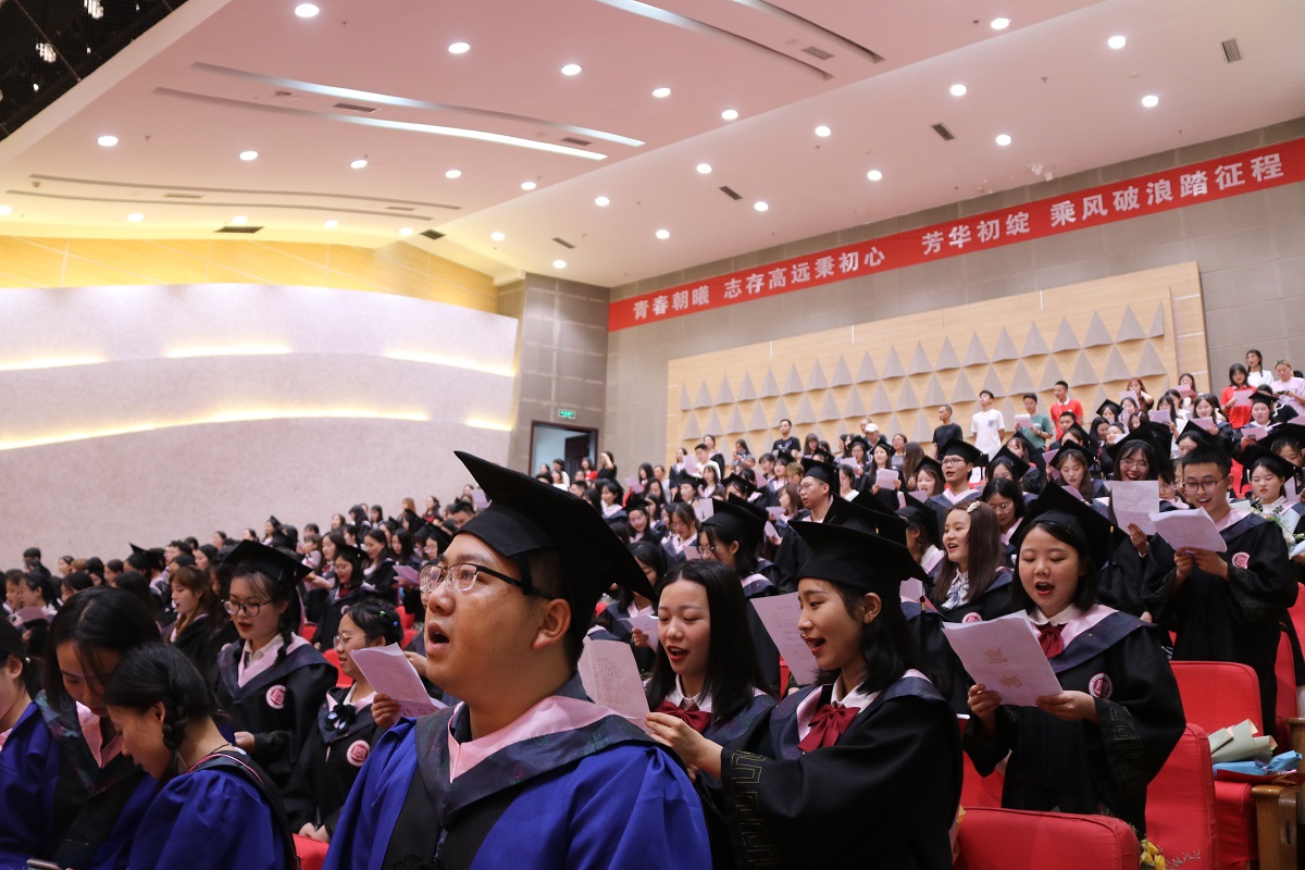 在庄严的国歌声中,毕业典礼拉开帷幕。在观看毕业视频后,毕业典礼正式开始。
