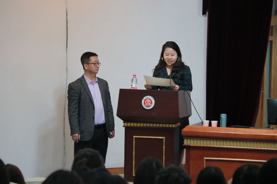 2010届校友陈海龙主讲,学院副院长侯玲主持会议并为陈海龙老师颁发聘书,2019级全体学生参与讲座。
