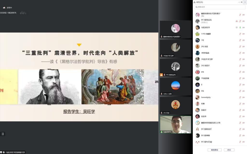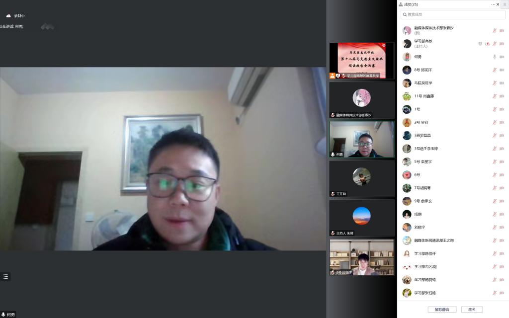 为加强青年学子对马列经典著作的认识和理解,引导青年学子深刻领会马克思主义的科学性和真理性,感悟马克思主义真理力量和实践力量,2022年12月8日14时30分,学院通过线上方式举办第十八届马克思主义经典阅读报告会决赛。本次大赛特邀学院刘忠荣副教授、王开莉副教授、何勇副教授担任评委。
